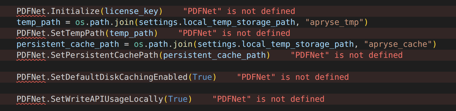 However, I have quite some trouble to get the Pylance extension to accept the Apryse SDK references, it keeps adding orange and red underlines to say it cannot find the type, e.g. PDFNet.something and any other imports from apryse_sdk.