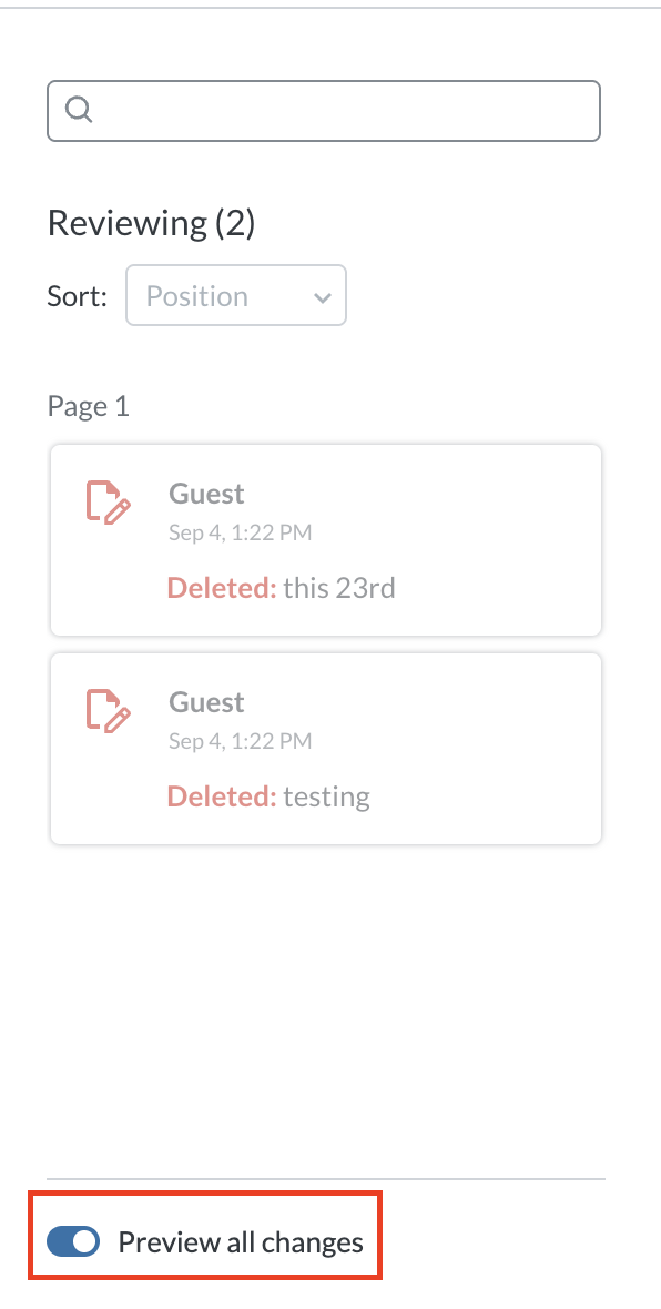 There is currently no API to toggle this button to preview the changes (or “hide” deleted changes) however you may be able to select the element through a querySelector and toggling in that way. You can listen for the visibilityChanged event that opens the review panel “officeEditorReviewPanel” and if the toggle element exists, you can toggle it with .click().