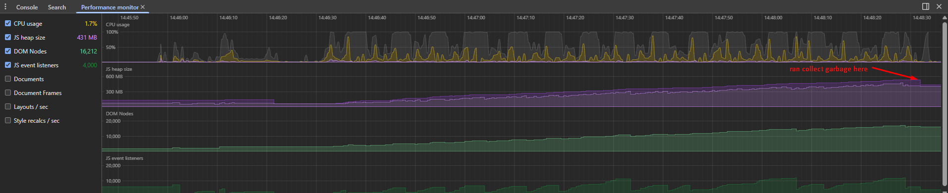 - Force garbage collection: heap stays at 118MB (no decrease, not returning to a normal baseline)