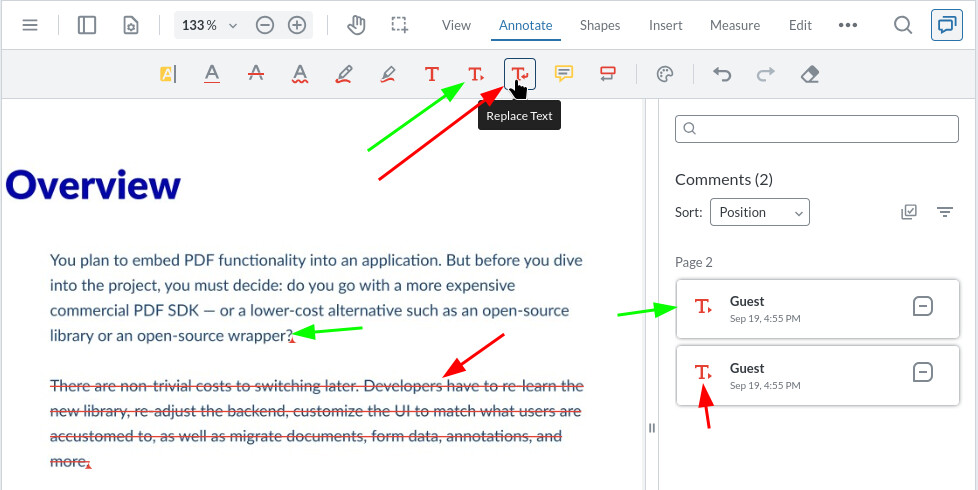 In the WebViewer, the icon displayed in the Comments sidebar for the Replace Text annotation is incorrect. The expected Replace Text icon is not shown; instead, the Insert Text icon (the red arrow symbol) appears. The Insert Text annotation itself functions correctly.
